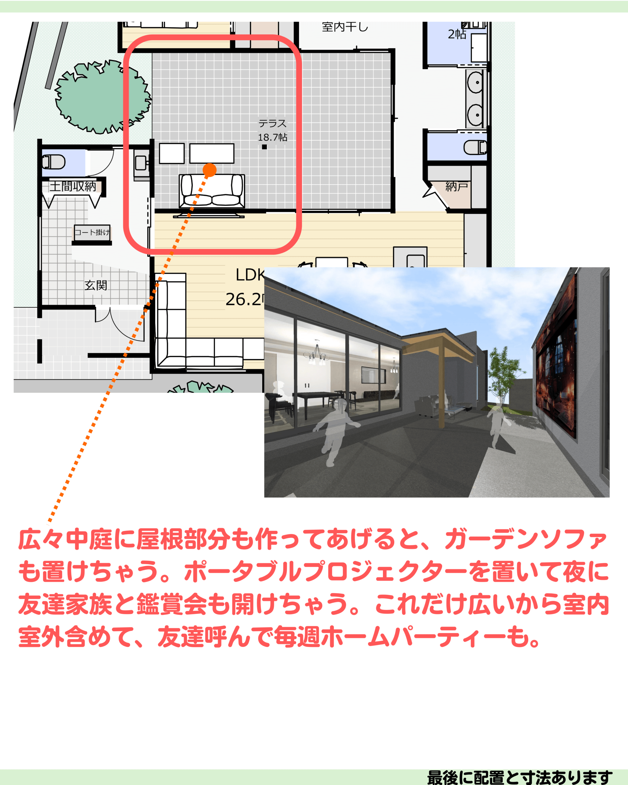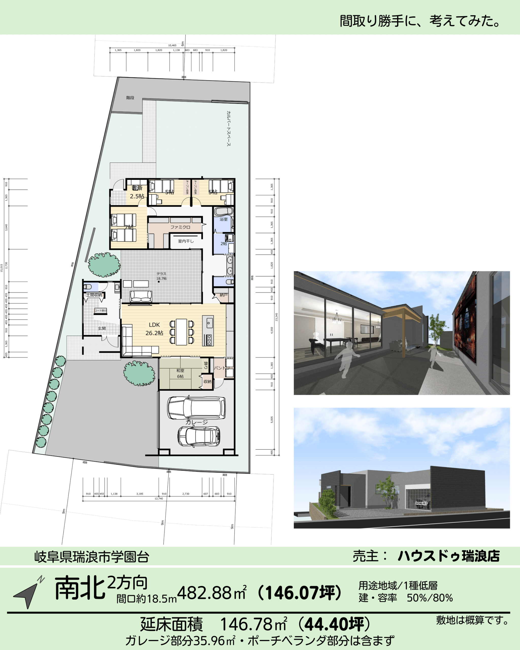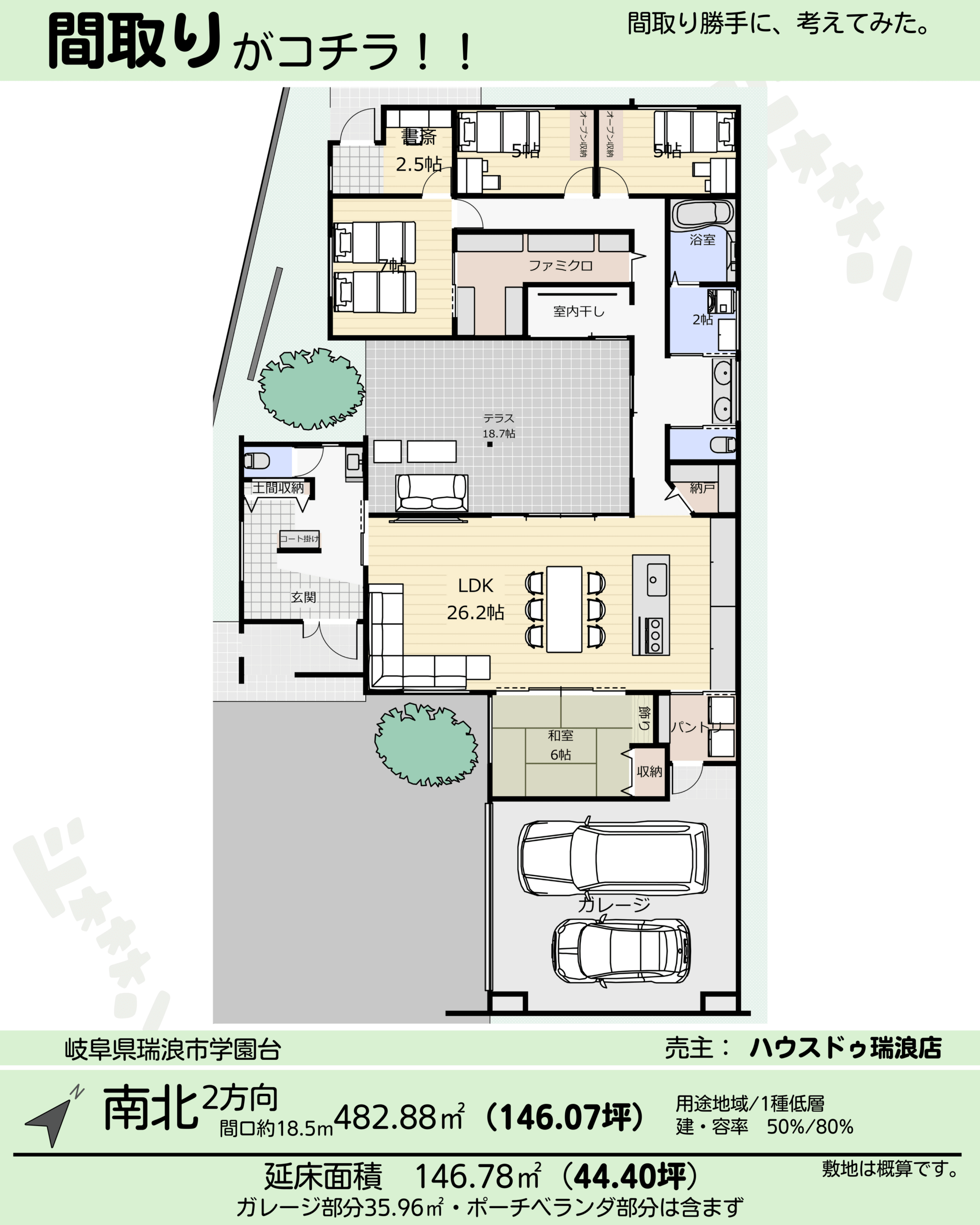 間取り44坪/平屋4LDK中庭ガレージ